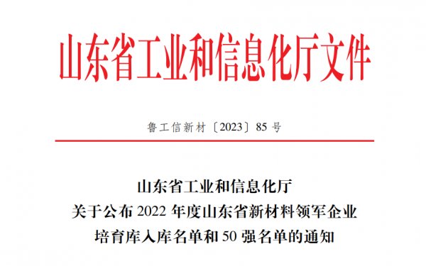 5月19日,山东省工业和信息化厅公布《2022年度山东省新材料领军企业培育库入库名单》和《2022年度山东省新材料领军企业50强名单》,williamhill官网荣登双榜!